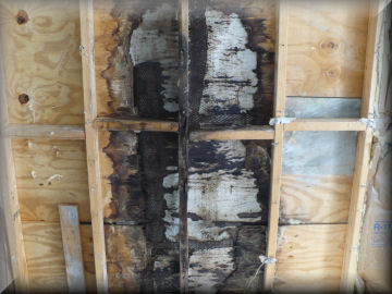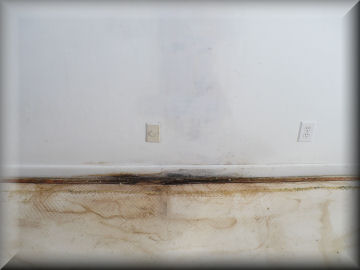 Here the damage to the baseboards is visible and purplish staining can been seen in the center of the picture on the drywall. This wall is an exterior wall, the damage is coming from outside 5 foot up the wall, that is where the 2nd floor house trim meets the wall. This is a design flaw in homes we at Terramar see a lot, worst is the damage that it causes goes undetected until it’s to late as can be seen in the picture to the right >>> the plywood has complete deterated away.