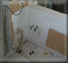 This picture shows the visible water staining & Mold damage on the outside of the shower, after removing the vanity. The meter in pictures above shows how high up the wall moisture contents go up the wall, from a leak at the bottom of the wall. When readings were done on the vanity it should that side of the vanity at 100% indicating that’s where the leak was. By using the Moisture reader we were able to zoom in on the spot of origin.